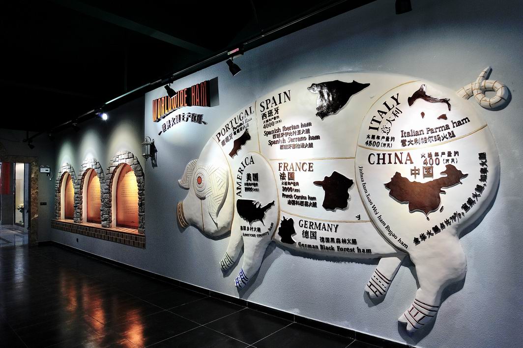 在世界火腿博覽館里,講述了火腿從絲綢之路一路傳播到世界各地,從中國一路出發(fā)到意大利、西班牙、法德英美等各國,隨著歷史變遷,在自然、人文、地理和氣候綜合因素下成就了世界各地各自不同的經典火腿文化,并通過歐洲火腿商鋪、窖藏庫、原料豬生長等場景復原形式讓人真切感受了世界各國的火腿文化魅力。