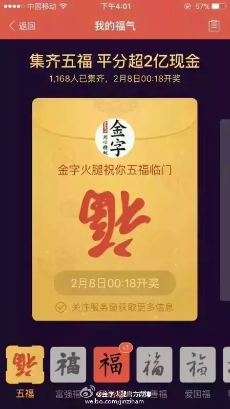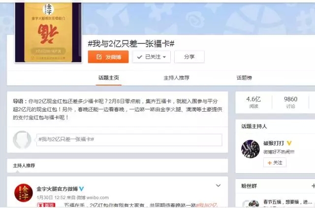 自前幾天支付寶將“集5福,搶2億+紅包”的活動(dòng)規(guī)則公布后,一時(shí)間,有關(guān)??〒Q贈(zèng)的話題強(qiáng)行霸屏。在有金字粉絲集齊了五福后,金字順勢(shì)在微博平臺(tái)上策劃的#我與2億只差一張???的微話題就引發(fā)了高達(dá)4.6億的閱讀量,網(wǎng)友們通過(guò)點(diǎn)贊評(píng)論及轉(zhuǎn)發(fā)分享的方式,第一時(shí)間表達(dá)了自己對(duì)于五福福卡和春晚2億紅包的高度期待!